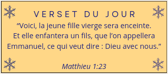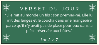 Voici notre avant-dernière publication, celle du 24 décembre. Nous vous invitons à lire le récit de la nativité qui se trouve au début des évangiles de Luc et de Matthieu, et à garder ces textes dans vos cœurs en ces temps de fêtes !